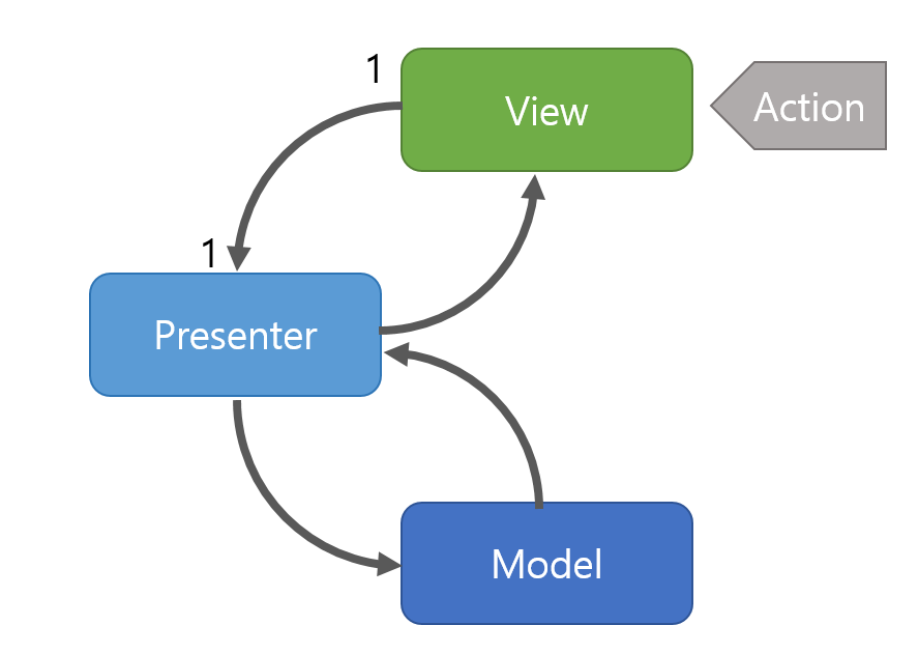 사용자의 입력은 View를 통해서 입력하게 되며, view-presenter의 관계는 1:1이다. 이전의 MVC에서는 view-controller가 1:n 관계였다.