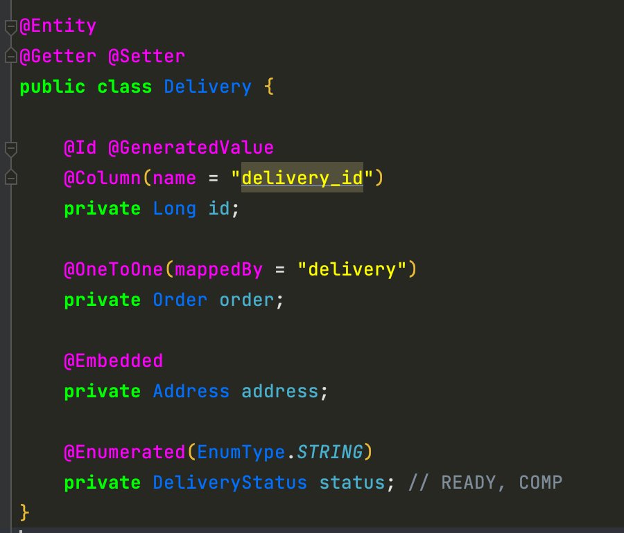 status 의 경우 DeliveryStatus 타입으로 직접 만든 enum 클래스의 타입이다.