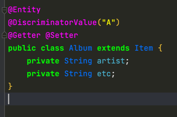 @DiscriminatorValue() 를 지정해서 구분 컬럼을 사용해주었다.