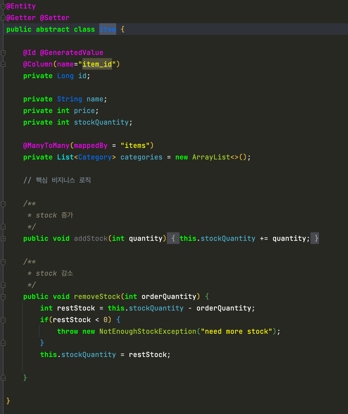 핵심 비지니스 로직을 엔티티 파일에 작성해줌으로써 응집력을 높여주었다. (상품 취소, 상품 조회)