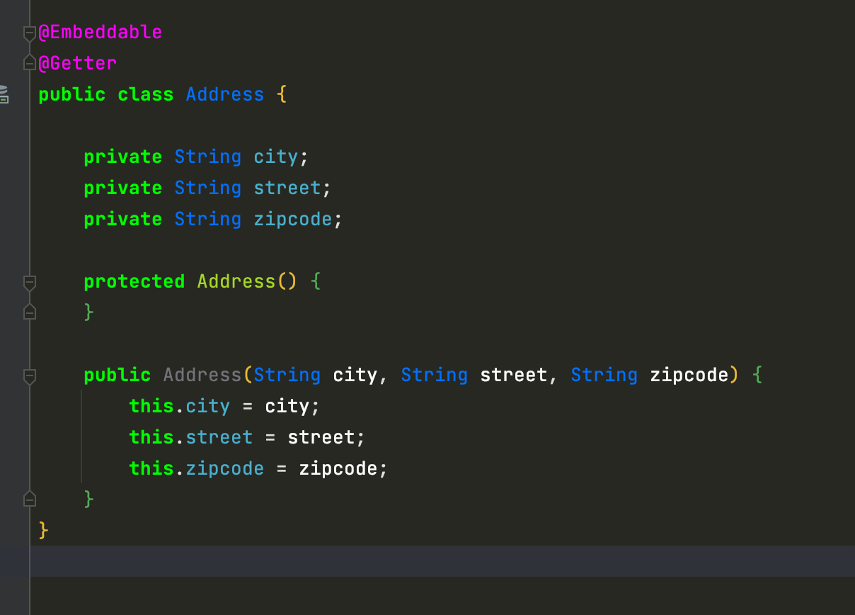 - 임베디드 타입은 기본 생성자가 필수이다. public한 생성자를 사용하도록 유도하기 위해 기본 생성자는 JPA가 제공해주는 또 다른 접근지정자인 protected를 사용하여 만들어주었다.