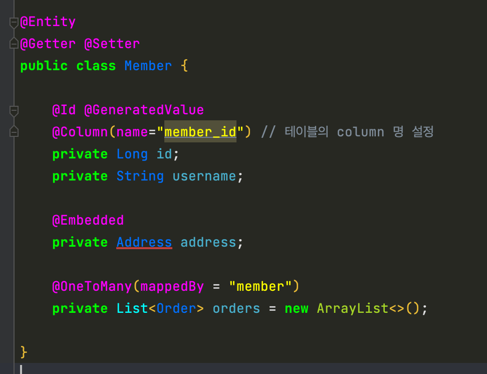 Order 입장에서 Member는 다대일 관계이기 때문에 @ManyToOne으로 연관관계 매핑을 해주었고, 다 쪽이 연관관계 주인으로 두기에 @JoinColumn(name="member_id") 로 외래키(FK)를 매핑해주었다.