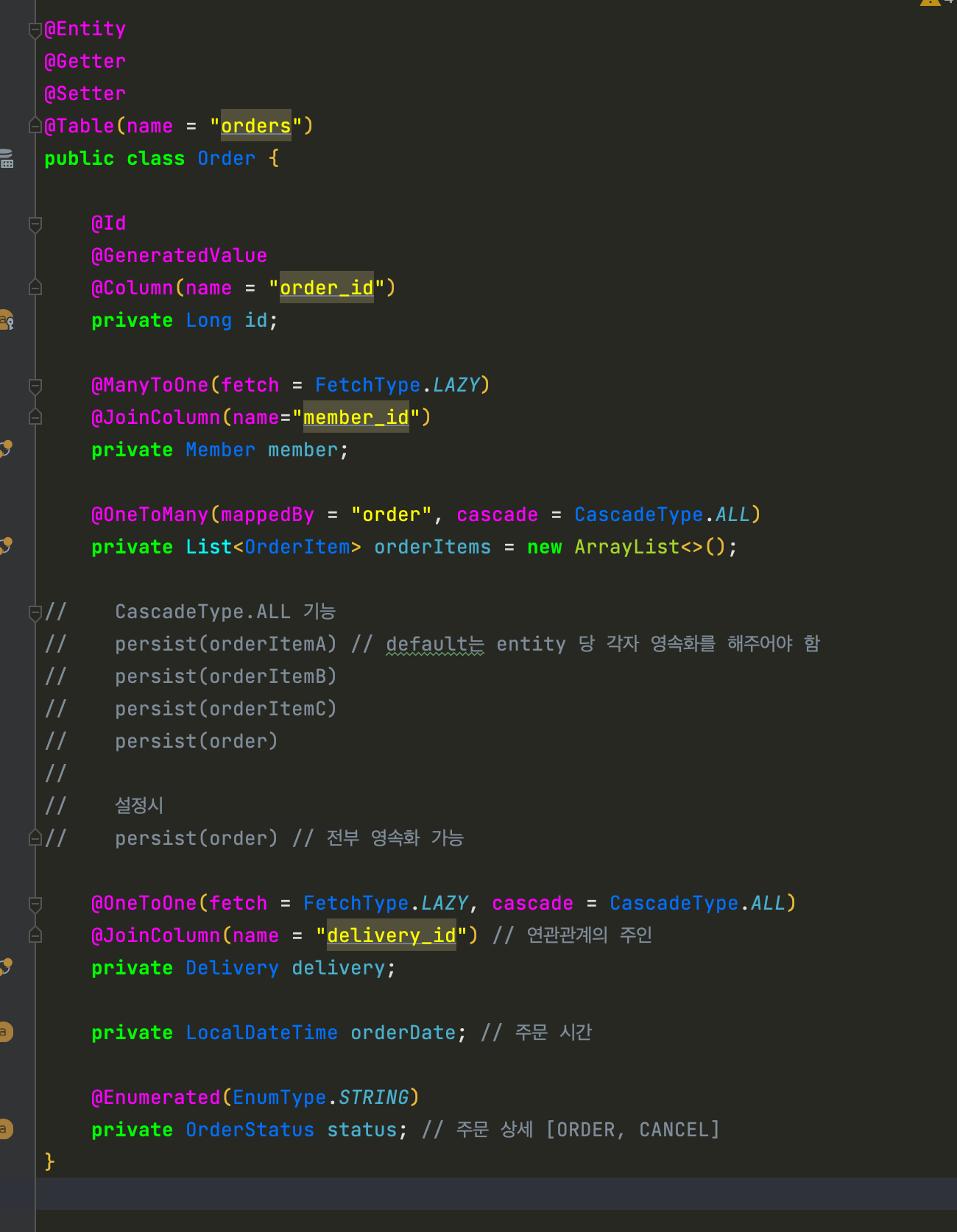 모든 orderItem을 persist해줄 필요 없이 cascade = CascadeType.ALL 을 통해 한 order에 있는 모든 주문상품을 영속화시킬 수 있다.