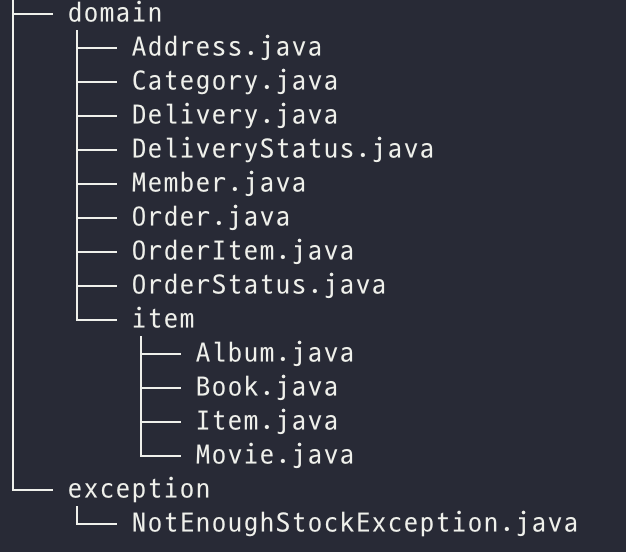 Order(주문)와 Item(상품)는 다대다 매핑이기 때문에 중간에 OrderItem(주문상품) 엔티티를 추가하여 일대다, 다대일로 풀어주었다.